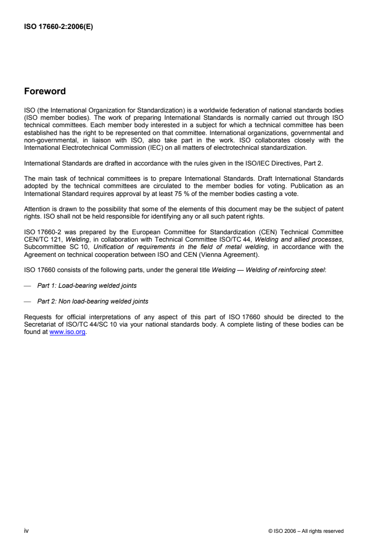 ISO 17660-2:2006 is a standard published by the International Organization for Standardization (ISO). Its full title is "Welding - Welding of reinforcing steel - Part 2: Non load-bearing welded joints". This standard covers: ISO 17660-2:2006 is applicable to the welding of weldable reinforcing steel and stainless reinforcing steel of non load-bearing welded joints, in workshops or on site. It specifies requirements for materials, design and execution of welded joints, welding personnel, quality requirements, examination and testing. Load-bearing welded joints are covered by ISO 17660-1.
