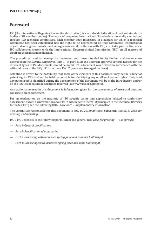 ISO 11901-3:2014 is a standard published by the International Organization for Standardization (ISO). Its full title is "Tools for pressing — Gas springs — Part 3: Gas spring with increased spring force and compact built height". This standard covers: ISO 11901-3:2014 specifies the dimensions (in millimetres), nominal initial forces and types of gas springs. It is applicable to gas springs with increased spring force and compact built height of type 1 700 to 200 000, pressurized with nitrogen with a nominal initial force of between 1 700 N ± 5 % and 200 000 N ± 5 %, for use in press tools. It also specifies marking, technical delivery conditions and designation.