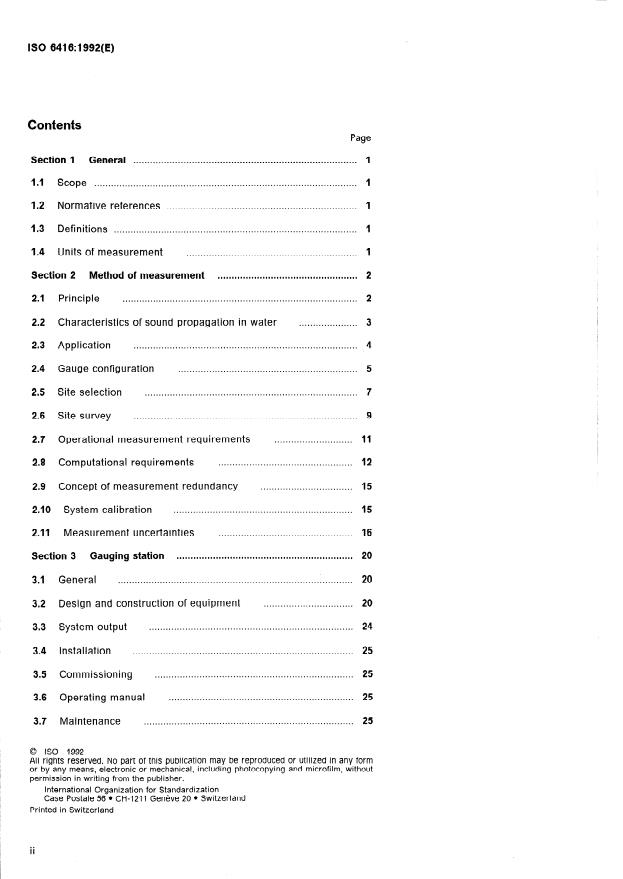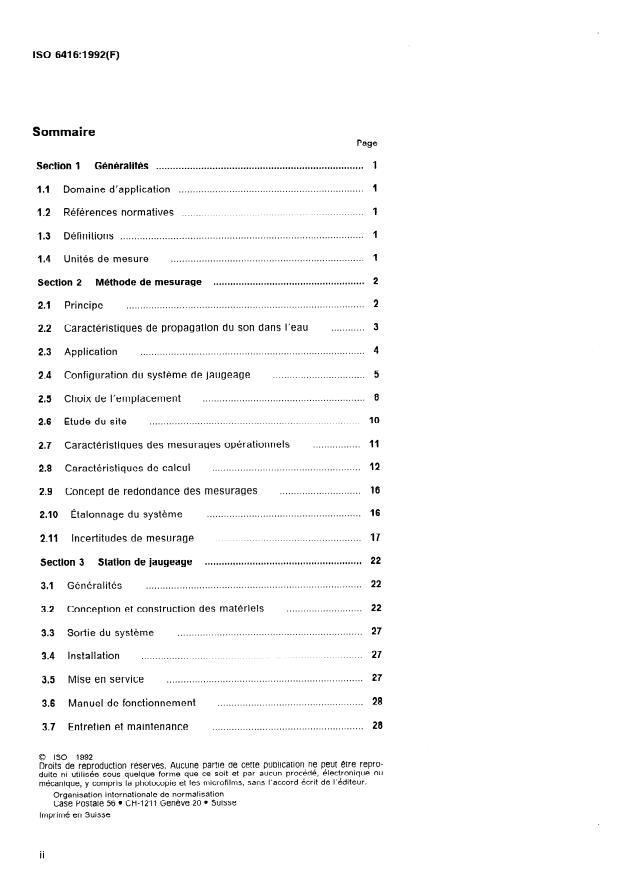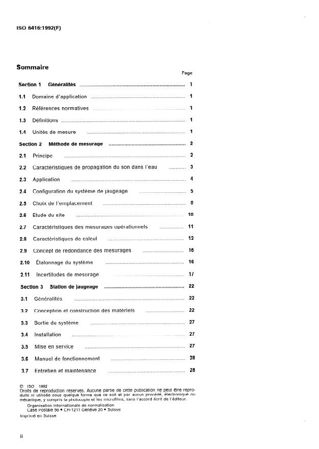 ISO 6416:1992 is a standard published by the International Organization for Standardization (ISO). Its full title is "Measurement of liquid flow in open channels — Measurement of discharge by the ultrasonic (acoustic) method". This standard covers: Describes the establishment and operation of an ultrasonic gauging station for the measurement of discharge in a river, an open channel, or a closed conduit with a free water surface. Is limited to the "time of travel of acoustic pulses" technique. Annex A describes the determination of flow direction.
