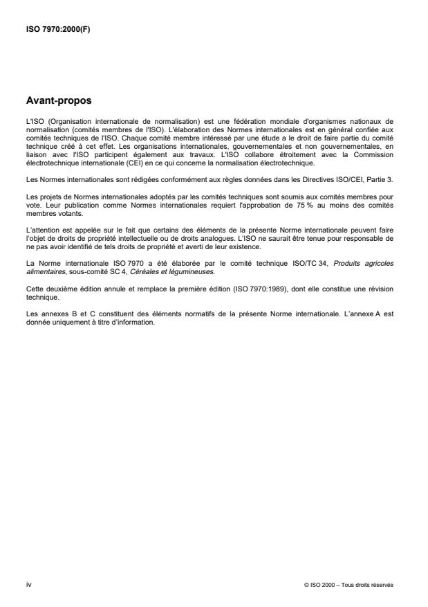 ISO 7970:2000 is a standard published by the International Organization for Standardization (ISO). Its full title is "Wheat (Triticum aestivum L.) — Specification". This standard covers: La présente Norme internationale fixe les spécifications minimales du blé tendre (Triticum aestivum L.) destiné à l'alimentation humaine, faisant l'objet du commerce international. Elle donne également une liste indicative des graines nuisibles et toxiques (annexe A), une liste des acariens et insectes déprédateurs des céréales stockées qui ne sont pas acceptables (annexe B) et une méthode de détermination des impuretés (annexe C).