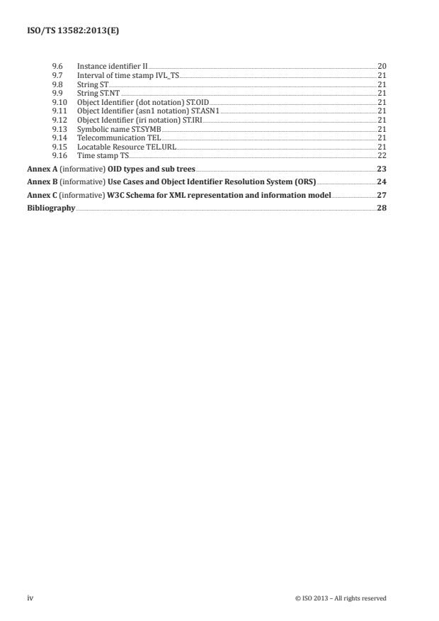 ISO/TS 13582:2013 specifies the mandatory and optional information to be recorded in any registry of OIDs, using an information model. It specifies which parts of that information are to be regarded as public, and which parts are to be subject to security and privacy requirements.