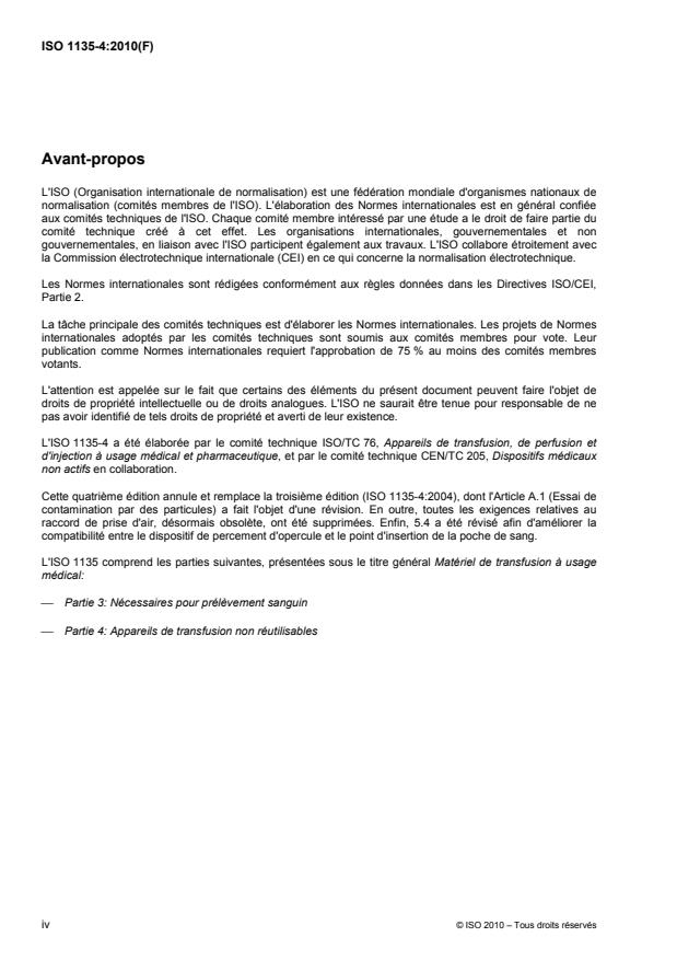 L'ISO 1135-4:2010 spécifie les exigences applicables aux appareils de transfusion à usage médical, non réutilisables, afin d'assurer leur compatibilité avec les conteneurs renfermant du sang et des composants du sang, ainsi qu'avec les appareils intraveineux. Le deuxième objectif de l'ISO 1135-4:2010 est de donner des directives sur les spécifications relatives à la qualité et aux performances des matériaux utilisés dans les appareils de transfusion, et de proposer une terminologie relative aux composants de ces derniers. Dans certains pays, la pharmacopée nationale ou d'autres réglementations nationales sont légalement contraignantes et priment sur l'ISO 1135-4:2010.