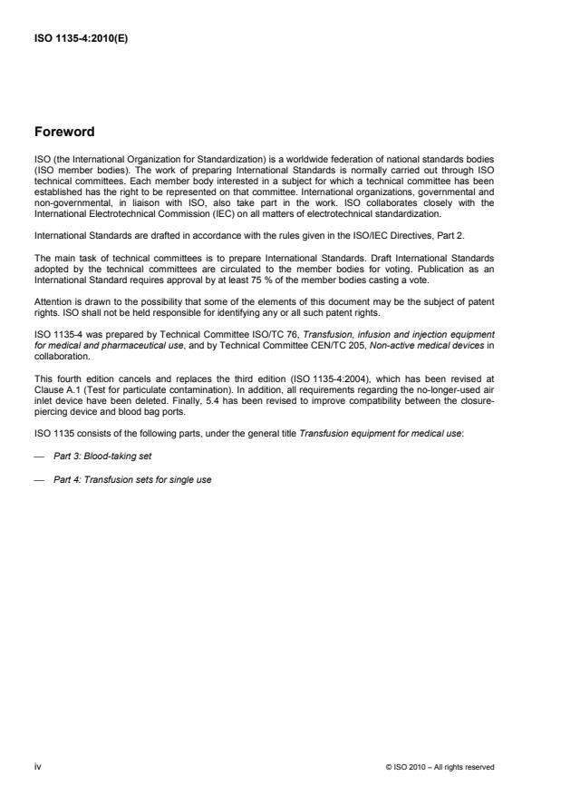 ISO 1135‑4:2010 specifies requirements for single-use transfusion sets for medical use in order to ensure their compatibility with containers for blood and blood components as well as with intravenous equipment. Secondary aims of ISO 1135‑4:2010 are to provide guidance on specifications relating to the quality and performance of materials used in transfusion sets and to present designations for transfusion set components. In some countries, the national pharmacopoeia or other national regulations are legally binding and take precedence over ISO 1135‑4:2010.