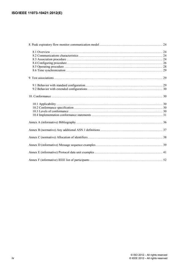 ISO/IEEE 11073-10421:2012 is a standard published by the International Organization for Standardization (ISO). Its full title is "Health informatics - Personal health device communication - Part 10421: Device specialization - Peak expiratory flow monitor (peak flow)". This standard covers: Within the context of the ISO/IEEE 11073 family of standards for device communication, a normative definition of communication is established in ISO/IEEE 11073-10421:2012 between personal telehealth peak expiratory flow monitor devices and compute engines (e.g. cell phones, personal computers, personal health appliances, and set top boxes) in a manner that enables plug-and-play interoperability. Appropriate portions of existing standards are leveraged, including ISO/IEEE 11073 terminology, information models, application profile standards, and transport standards. The use of specific term codes, formats, and behaviors is specified in telehealth environments restricting optionality in base frameworks in favor of interoperability. A common core of communication functionality is defined for personal telehealth peak expiratory flow monitor devices.
