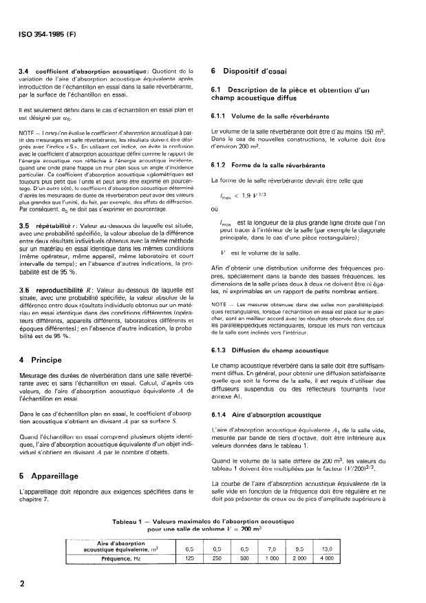 ISO 354:1985 is a standard published by the International Organization for Standardization (ISO). Its full title is "Acoustics — Measurement of sound absorption in a reverberation room". This standard covers: Specifies a method of measuring the sound absorption coefficient of acoustical materials used as wall or ceiling treatments or the equivalent sound absorption area of objects, such as furniture, persons or space absorbers.