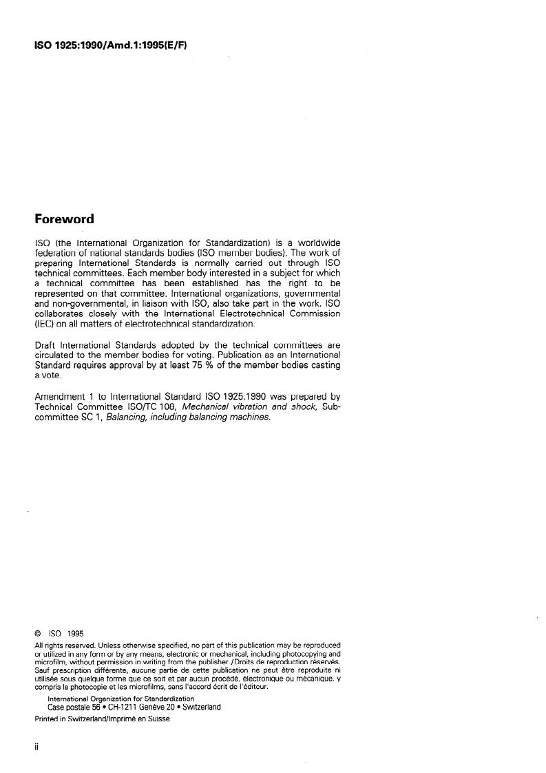 ISO 1925:1990/Amd 1:1995 is a standard published by the International Organization for Standardization (ISO). Its full title is "Mechanical vibration — Balancing — Vocabulary — Amendment 1". This standard covers: Mechanical vibration — Balancing — Vocabulary — Amendment 1
