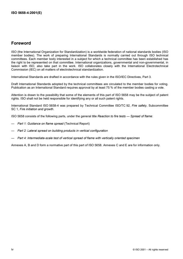 ISO 5658-4:2001 is a standard published by the International Organization for Standardization (ISO). Its full title is "Reaction to fire tests - Spread of flame - Part 4: Intermediate-scale test of vertical spread of flame with vertically oriented specimen". This standard covers: 1.1 This part of ISO 5658 specifies an intermediate-scale method of test for measuring the vertical spread (upward and downward) of flame over a specimen of a product orientated in the vertical position. A measure of lateral spread can also be obtained. It provides data suitable for comparing the performance of materials, composites or assemblies, which are used as the exposed surfaces of walls or other vertically orientated products in construction applications. Some products with profiled surfaces can also be tested with a modified procedure representative of the end-use conditions of the product. 1.2 Upward flame spread is not limited to surfaces which are vertical. It is recognized that an enhanced form of upward, wind-aided flame spread can also occur on surfaces at an angle greater than 20° from the horizontal without any external ventilation. This type of flame spread can occur in both planar sloping surfaces and stepped surfaces such as stairs. Flame spread in these situations can become very rapid and can cause serious problems in escape ways such as staircases. When assessing stepped or sloping surface materials, it may be more appropriate to use a vertical flame spread test rather than a test in which the specimen is horizontal. 1.3 This part of ISO 5658 is applicable to the measurement and description of the properties of materials, products, composites or assemblies in response to radiative heat in the presence of non-impinging pilot flames under controlled laboratory conditions. The heat source may be considered to represent a single burning item such as a wastepaper bin or an upholstered chair within an enclosure, and this scenario would generally be considered to apply during the early developing stage of a fire (see ISO/TR 11696-1 and ISO/TR 11696-2). This part of ISO 5658 should not be used alone to describe or appraise the fire hazard or fire risk of materials, products, composites or assemblies under actual fire conditions.