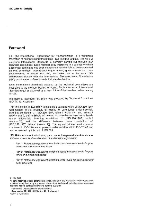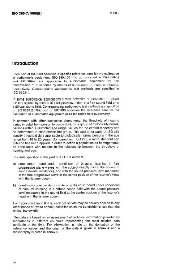 ISO 389-7:1996 is a standard published by the International Organization for Standardization (ISO). Its full title is "Acoustics — Reference zero for the calibration of audiometric equipment — Part 7: Reference threshold of hearing under free-field and diffuse-field listening conditions". This standard covers: Specifies a reference threshold of hearing for the calibration of audiometric equipment used under definite conditions. The listeners are otologically normal persons in the age from 18 to 25 years inclusive. The data are given in numerical form for the preferred frequencies in the one-third-octave series from 20 Hz to 16 000 Hz in accordance with ISO 266.