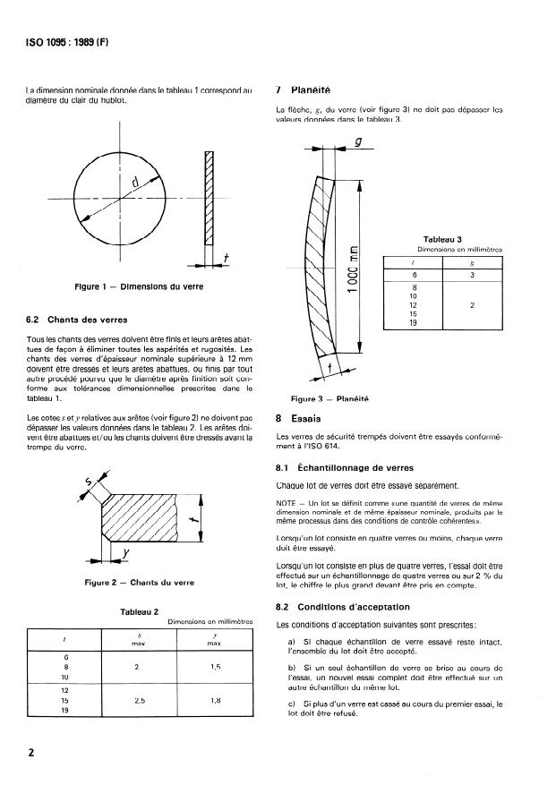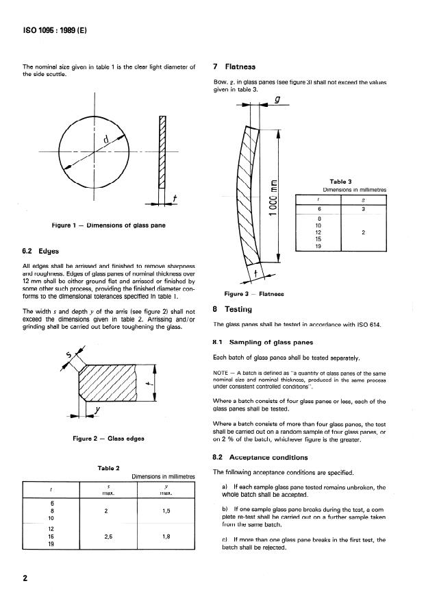 ISO 1095:1989 is a standard published by the International Organization for Standardization (ISO). Its full title is "Shipbuilding and marine structures — Toughened safety glass panes for side scuttles". This standard covers: Specifies materials and finish, dimensions for interchangeability, tolerances and flatness, testing, marking and designation complying with ISO 1751.
