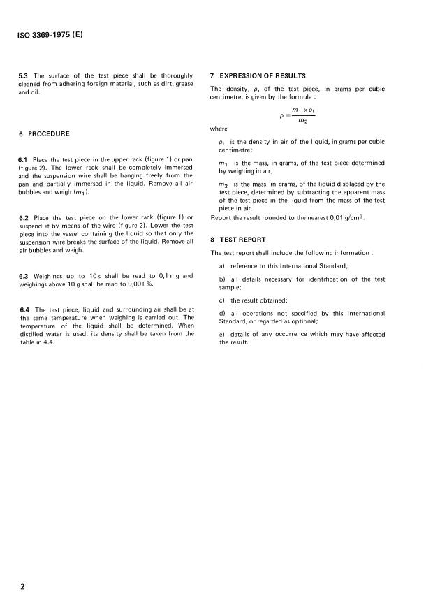 ISO 3369:1975 is a standard published by the International Organization for Standardization (ISO). Its full title is "Impermeable sintered metal materials and hardmetals — Determination of density". This standard covers: For determination of density of permeable sintered metal materials see ISO 2738. Specifies principle, apparatus, sampling, procedure, expression of results and test report. The two figures illustrate the weighing in water and the weighing in air.