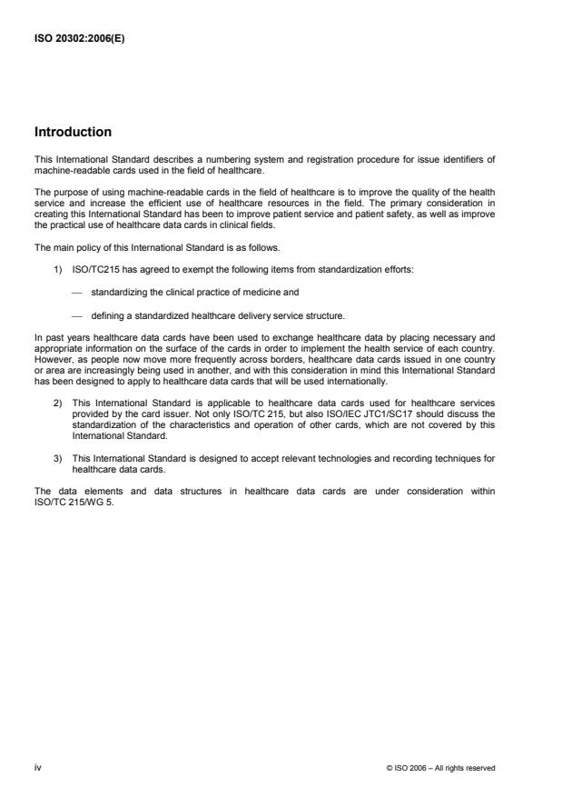 ISO 20302:2006 is designed to confirm, via a numbering system and registration procedure, the identities of both the healthcare application provider and the health card holder in order that information may be exchanged by using cards issued for healthcare service. ISO 20302:2006 focuses on the machine-readable cards of ID-1 type defined in ISO/IEC 7810 that are issued for healthcare services provided in a service area that crosses the national borders of two or more countries/areas. ISO 20302:2006 applies to healthcare data cards where the issuer and the application provider are the same party. ISO 20302:2006 applies directly, or refers, to existing ISO standards for physical characteristics and recording techniques. Security issues follow the requirements of each healthcare data card system. In addition, this International Standard regulates the visual information written on the healthcare data card.