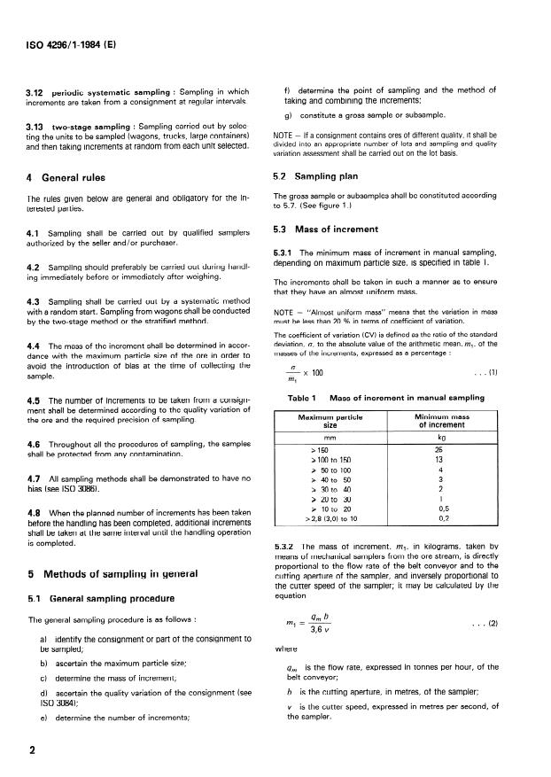 - Increment mass and frequency: Minimum increment masses and required numbers of increments depend on maximum particle size, consignment mass and the desired sampling precision. Tables in the standard specify minimum masses and numbers for manual and mechanical sampling.