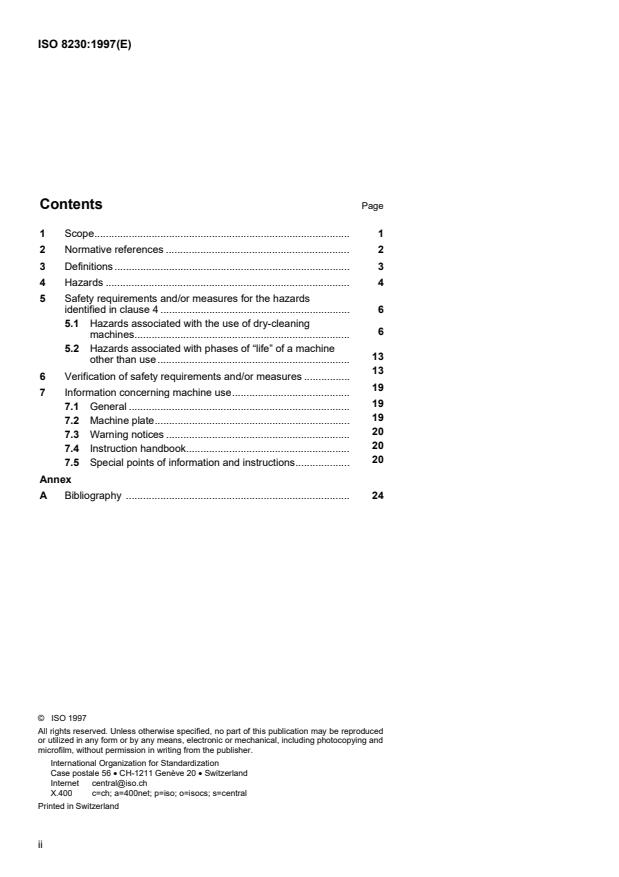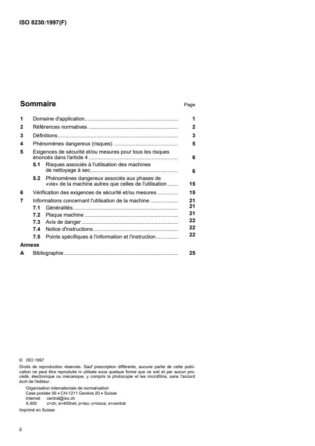 ISO 8230:1997 is a standard published by the International Organization for Standardization (ISO). Its full title is "Safety requirements for dry-cleaning machines using perchloroethylene". This standard covers: La présente Norme internationale est applicable aux machines de nettoyage à sec en circuit fermé à usage industriel (y compris les teintureries et atelier de nettoyage à sec) pour toutes tailles prévues pour le nettoyage des articles faits en textile, cuir, peaux ou fourrures utilisant exclusivement le perchloroéthylène1) (communément abrégé par perc) comme solvant liquide. La présente Norme internationale n'est pas applicable aux: -- machines mises à la disposition du public, par exemple les self-services; -- machines en circuit ouvert, utilisant du perc et travaillant en dessous de la pression atmosphérique; -- machines barrière; -- presses à repasser (voir ISO 10472-1 et ISO 10472-6); -- machines à portes automatiques; -- équipements auxiliaires, comme par exemple les systèmes de renouvellement d'air du local de récupération des déchets provenant du distillateur, de l'unité extérieure de refroidissement d'eau ou les systèmes de récupération complémentaires de perc provenant des boues de distillation. La présente Norme internationale identifie tous les phénomènes dangereux significatifs résultant de l'utilisation de la machine, en mettant l'accent tout particulièrement sur les phénomènes dangereux inhérents au solvant, où "l'utilisation de la machine" comprend à la fois l'utilisation normale et les mauvais usages prévisibles. Aucun conseil technique spécifique n'est donné concernant les phénomènes dangereux (autres que ceux résultant de l'utilisation des machines) survenant pendant la 1635construction, le transport et la mise en service, la mise hors service, le démontage et la mise au rebut des machines. La présente Norme internationale s'applique en premier aux machines fabriquées après sa date de publication. Elle ne donne pas de conseil technique spécifique concernant: -- les systèmes pneumatiques; -- le bruit; -- les risques causés par du linge imbibé de solvant pouvant créer des vapeurs explos