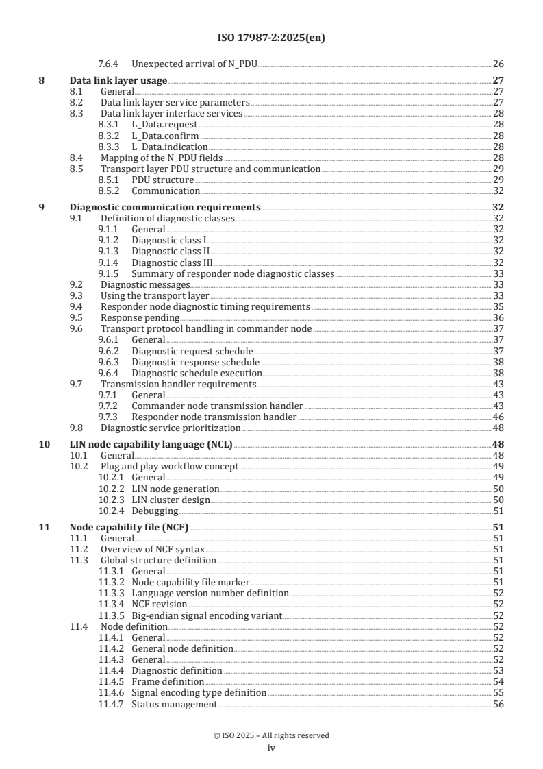 Keywords: ISO 17987-2:2025, LIN transport protocol, Local Interconnect Network, LIN diagnostics, transport layer, N_PDU, N_PCI, NCL, NCF, ISO 14229-2, ISO 15765-2.