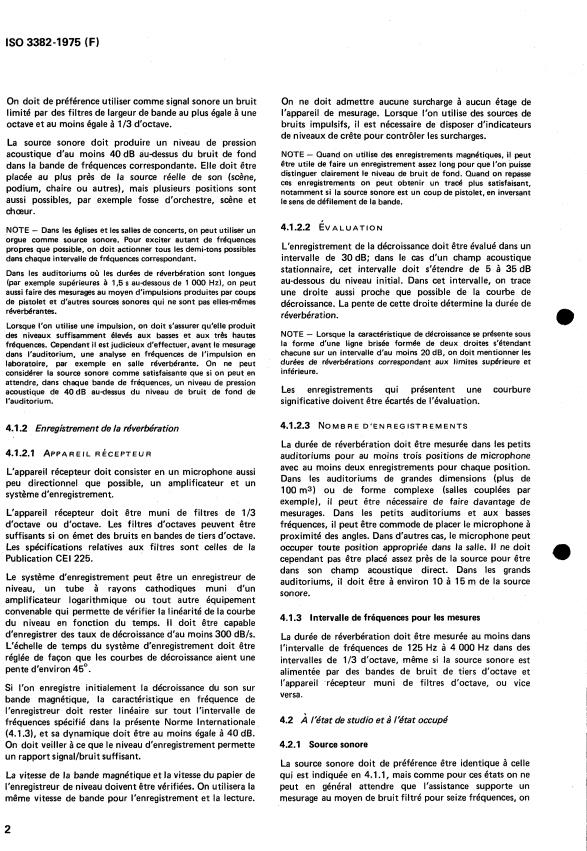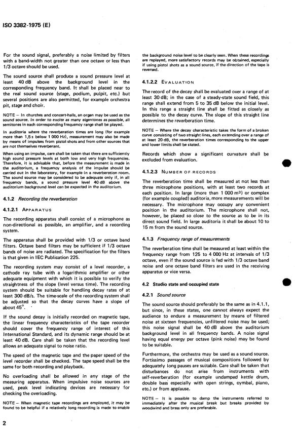 ISO 3382:1975 is a standard published by the International Organization for Standardization (ISO). Its full title is "Acoustics — Measurement of reverberation time in auditoria". This standard covers: Acoustics — Measurement of reverberation time in auditoria