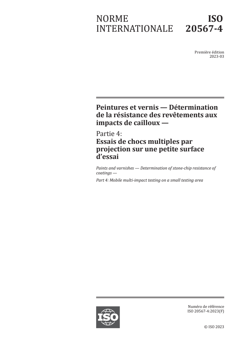 ISO 20567-4:2023 - Peintures et vernis — Détermination de la résistance des revêtements aux impacts de cailloux — Partie 4: Essais de chocs multiples par projection sur une petite surface d’essai Released:2/6/2024