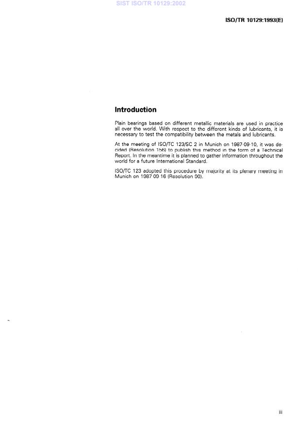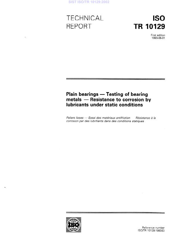 ISO/TR 10129:1993 is a technical report published by the International Organization for Standardization (ISO). Its full title is "Plain bearings — Testing of bearing metals — Resistance to corrosion by lubricants under static conditions". This standard covers: Specifies in detail a corrosion test under conditions of static load, i.e. without any mechanical action taking place simultaneously. In order for corrosion tests to be evaluated and compared, it is necessary to carry them out in accordance with the conditions laid down in this report.