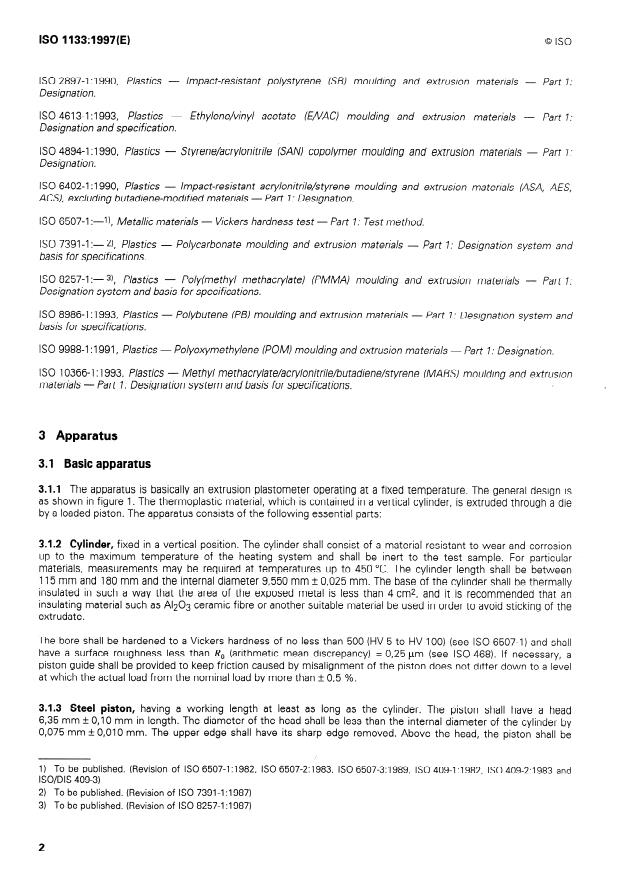 ISO 1133:1997 is a standard published by the International Organization for Standardization (ISO). Its full title is "Plastics - Determination of the melt mass-flow rate (MFR) and the melt volume-flow rate (MVR) of thermoplastics". This standard covers: Describes a method for the determination of the melt mass-flow rate (MFR) and the melt volume-flow rate (MFR) of thermoplastics under specified conditions of temperature and load. Does not apply to thermoplastics for which the rheological behaviour is affected by hydrolysis, condensation or crosslinking. Replaces the second edition.