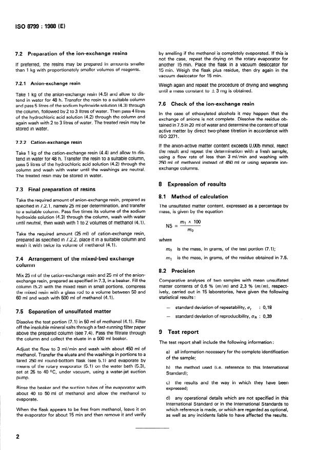 ISO 8799:1988 is a standard published by the International Organization for Standardization (ISO). Its full title is "Surface active agents — Sulfated ethoxylated alcohols and alkylphenols — Determination of content of unsulfated matter". This standard covers: From a methanolic solution of the test portion, the unsulfated matter is separated on an ion-exchange column (filled with a mixture of cation-exchange resins and anion-exchange resins). The unsulfated matter is recovered from the eluate by evaporation and weighing of the residue.