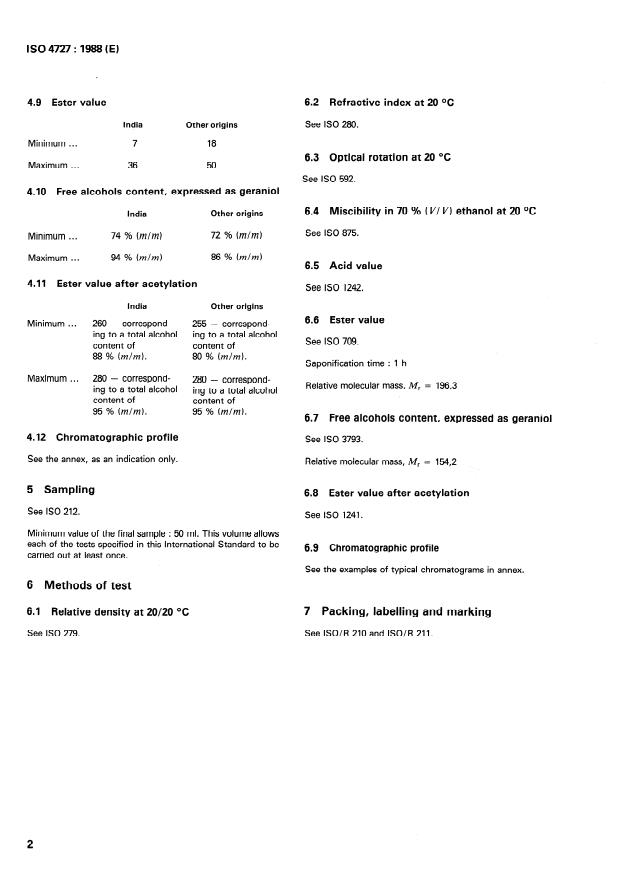 ISO 4727:1988 is a standard published by the International Organization for Standardization (ISO). Its full title is "Oil of palmarosa (Cymbopogon martinii (Roxburgh) W. Watson var. motia)". This standard covers: The Standard specifies the following characteristics of the oil. Appearance: Clear, mobile liquid. Colour: Pale yellow. Odour: Characteristic rose like, with grassy note. Relative density at 20/20 °C: 0,880 - 0,894. Refractive index at 20 °C: 1,4710 - 1,4780. Optical rotation at 20 °C: Range from - 1,4 to + 3 . Miscibility with 70 % (V/V) ethanol at 20 °C: 1 : 2. Acid value: Maximum 1,0. Further on permissible values for ester value, free alcohols content and ester value after acetylation are given. Two typical chromatograms are shown.