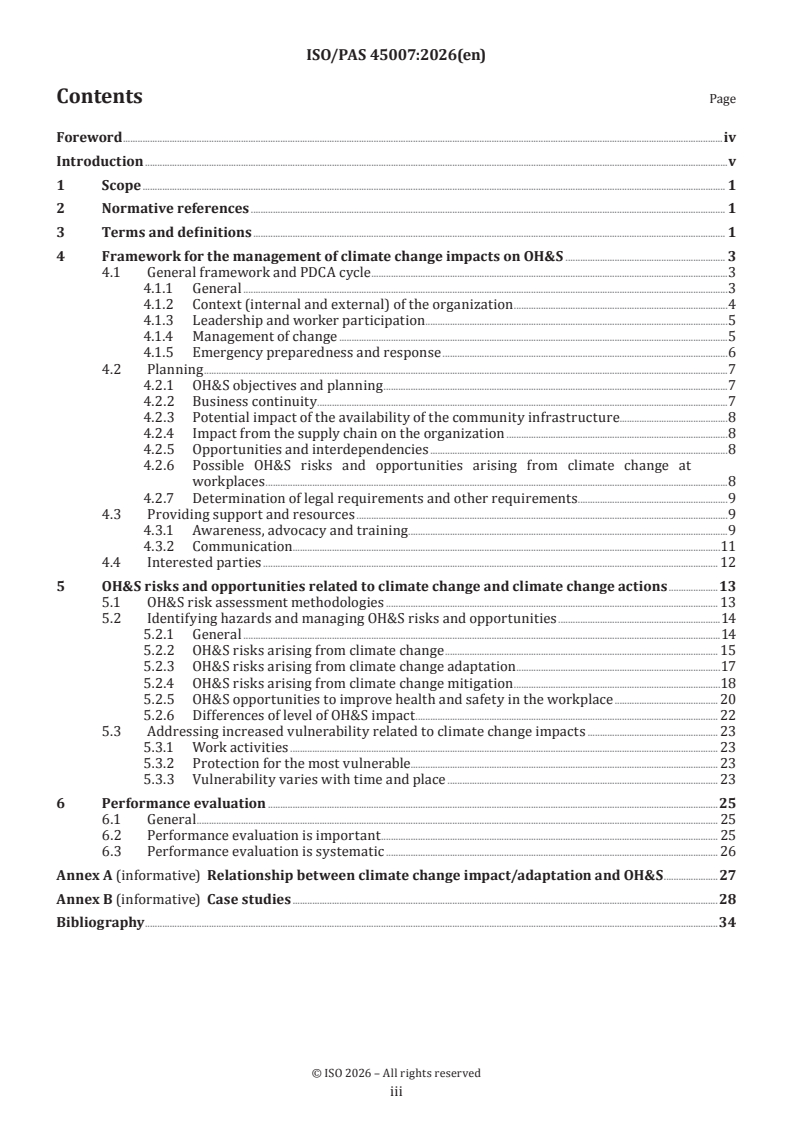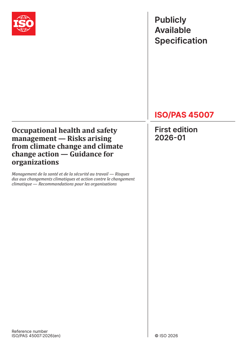 ISO/PAS 45007:2026 is a technical specification published by the International Organization for Standardization (ISO). Its full title is "Occupational health and safety management — Risks arising from climate change and climate change action — Guidance for organizations". This standard covers: This document gives guidance to organizations on planning for and addressing occupational health and safety (OH&S) risks arising from climate change and climate change action, including: — OH&S risks which arise as a result of climate change adaptation efforts, including changing ways of working and work processes, and infrastructure upgrades; — OH&S risks arising from climate change mitigation actions; — OH&S opportunities arising from both climate change adaptation and mitigation actions. This document is applicable to all organizations taking a systematic approach to addressing OH&S risks arising from climate change. It is applicable to organizations of all sizes including small and medium-sized enterprises (SMEs).