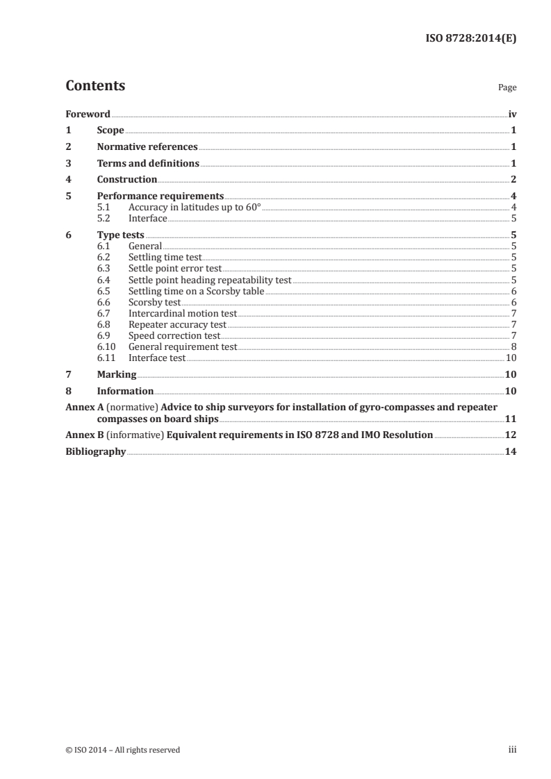 ISO 8728:2014 specifies the construction, performance, and type testing for gyro-compasses required by Regulation 12 of Chapter V of SOLAS 1974 (as amended).