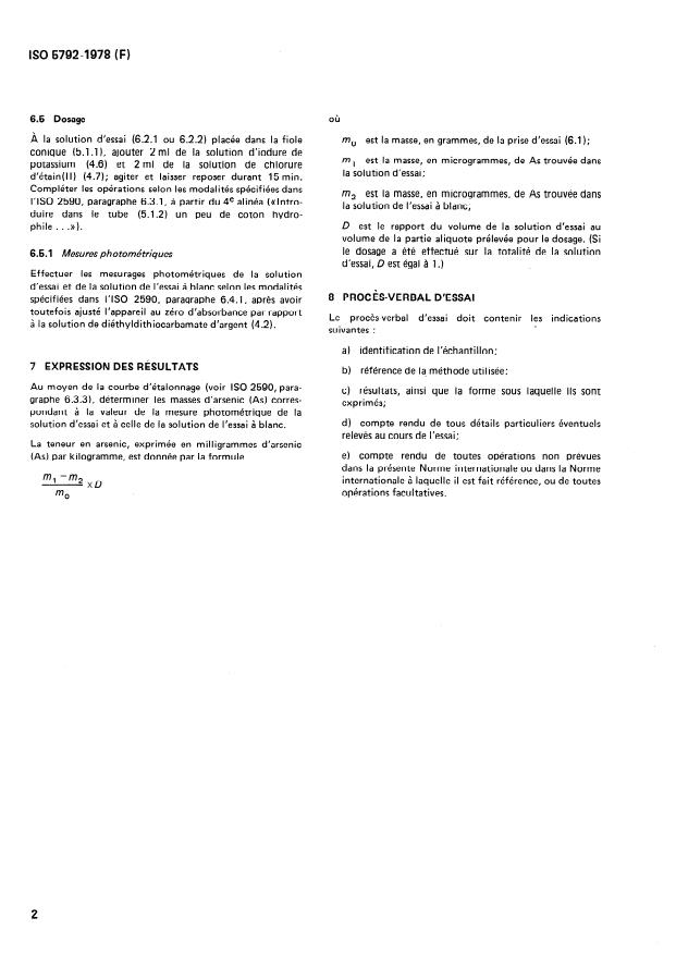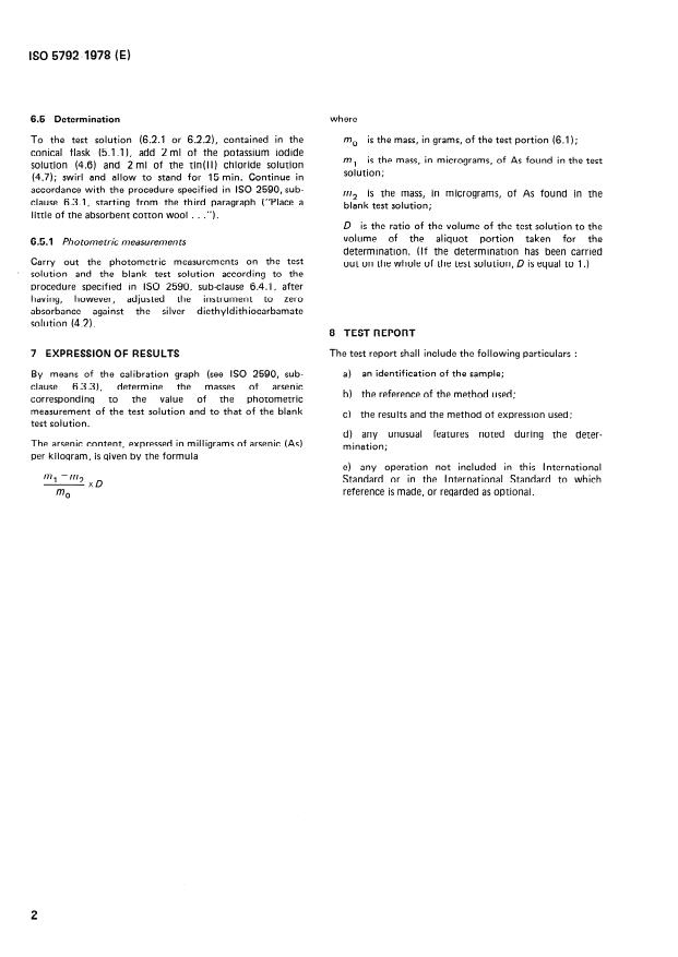 ISO 5792:1978 is a standard published by the International Organization for Standardization (ISO). Its full title is "Sulphuric acid for industrial use — Determination of arsenic content — Silver diethyldithiocarbamate photometric method". This standard covers: Describes a method applicable to products having aresenic contents equal to or greater than 0,1 mg/kg. As far as principle, the reagents and apparatus to be used are concerned, reference is made to ISO 2590, with some modifications added. For example, the reduction of arsenic by zinc is carried out in sulphuric acid medium. Provides information on the expression of results and the particulars to be included in the test report. The annex lists ISO publications covering the same subject.