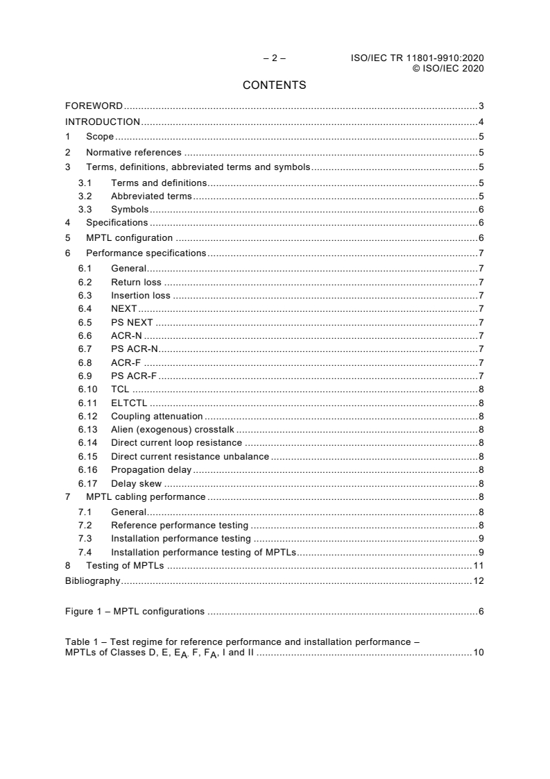 ISO/IEC TR 11801-9910:2020 is a Technical Report in the ISO/IEC 11801 family titled Information technology – Generic cabling for customer premises – Part 9910: Specifications for modular plug terminated link cabling. It defines and gives examples of modular plug terminated link (MPTL) configurations and provides performance specifications for MPTLs intended to support cabling Classes D, E, EA, F, FA, I and II. Edition 1.0 (2020-06) links MPTL requirements to the broader generic cabling framework and points to test methods in Clause 8, with test procedures specified in ISO/IEC 14763-4.