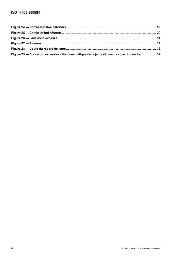 L'ISO 14400:2005 spécifie les exigences en matière d'utilisation, de maintenance générale et de sécurité des roues et des jantes dont elle définit les conditions de mise hors service, par exemple pour cause de fissuration, d'usure ou de déformation des roues. Elle est applicable aux roues destinées aux véhicules routiers définis dans l'ISO 3833 y compris les roues démontables des camions, mais à l'exclusion des roues de cycles et de motocycles.