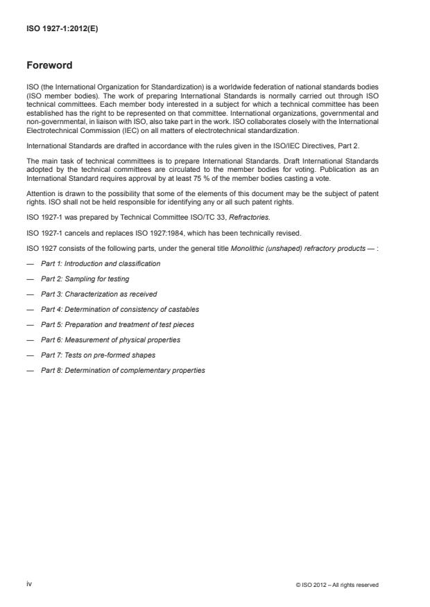 Keywords: ISO 1927-1, monolithic refractory, unshaped refractory products, castables, gunning materials, ramming mixes, classification temperature, alumina‑silica, basic refractories, refractory designation.