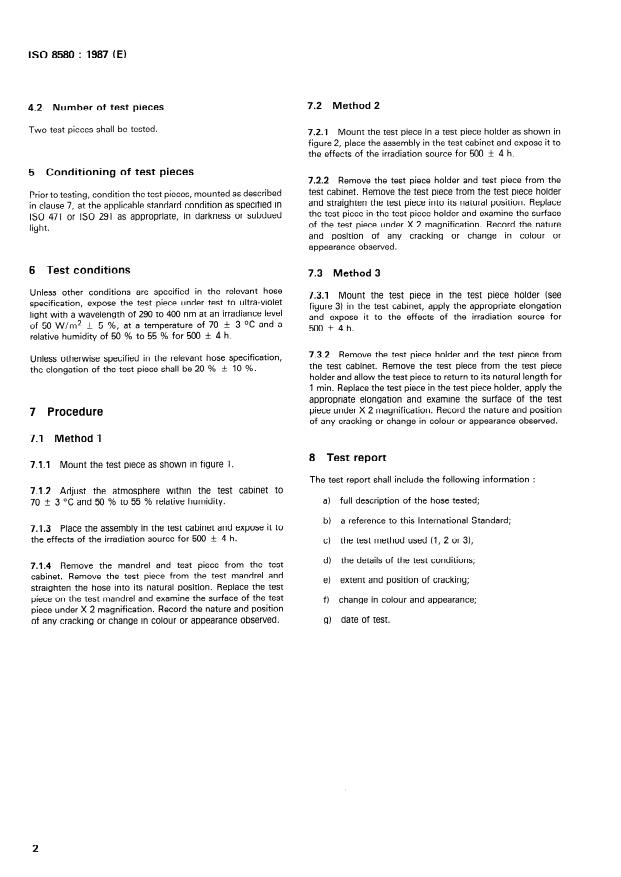 ISO 8580:1987 is a standard published by the International Organization for Standardization (ISO). Its full title is "Rubber and plastics hoses — Determination of ultra-violet resistance under static conditions". This standard covers: Provides a means of assessing the deterious effects of ultra-violet radiation under static conditions. specifies 3 methods: one for bore sizes up to 25 mm, tested on the hose itself; one for bore sizes greater than 25 mm, tested on a piece of the hose wall, and one for bore sizes greater than 25 mm, tested on a piece of the hose coating. The last method should only be used, if it is not possible to carry out the test in accordance with method two. 3 figures show the various test piece holders.