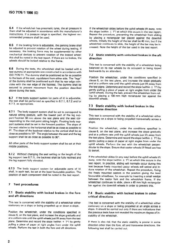 ISO 7176-1:1986 is a standard published by the International Organization for Standardization (ISO). Its full title is "Wheelchairs — Part 1: Determination of static stability". This standard covers: Wheelchairs — Part 1: Determination of static stability