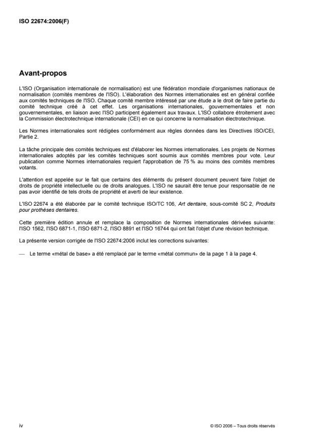 L'ISO 22674:2006 spécifie une classification des matériaux métalliques convenant à la fabrication des appareils et aux restaurations dentaires, y compris les matériaux métalliques d'utilisation recommandée soit avec revêtement céramique, soit sans revêtement céramique ou indifféremment avec ou sans, et spécifie les exigences qui leur sont applicables. Elle précise par ailleurs les exigences relatives au conditionnement et au marquage des produits et les instructions à fournir pour l'utilisation de ces matériaux.