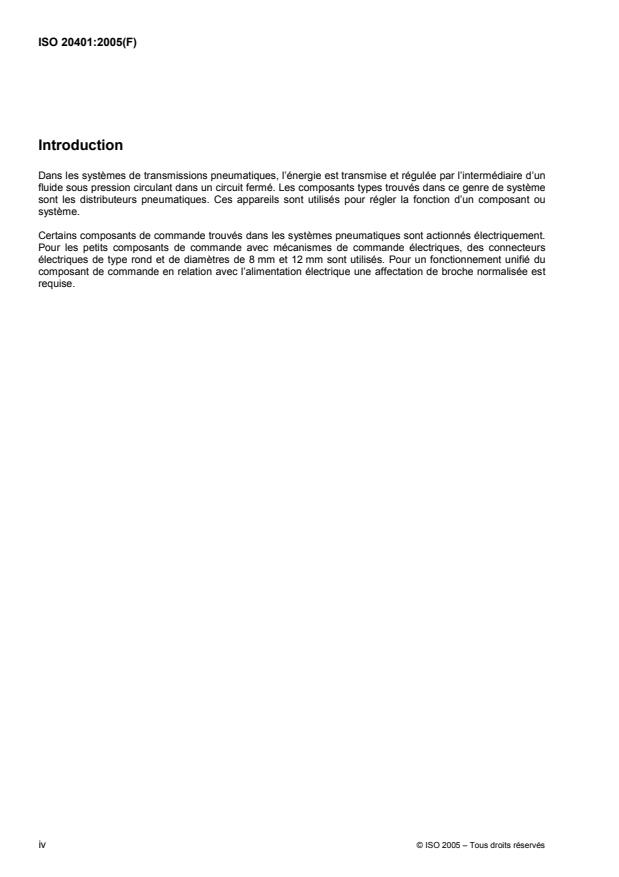 L'ISO 20401:2005 spécifie l'affectation des broches des mécanismes de commande électriques pour distributeurs de commande directionnels pneumatiques lorsqu'ils sont utilisés conjointement avec des connecteurs électriques conformes à la CEI 60947-5-2:2004.