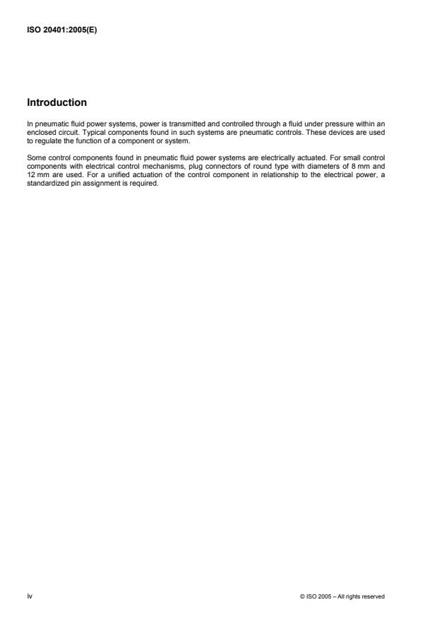 ISO 20401:2005 - Pneumatic fluid power systems -- Directional control valves -- Specification of pin assignment for electrical round connectors of diameters 8 mm and 12 mm