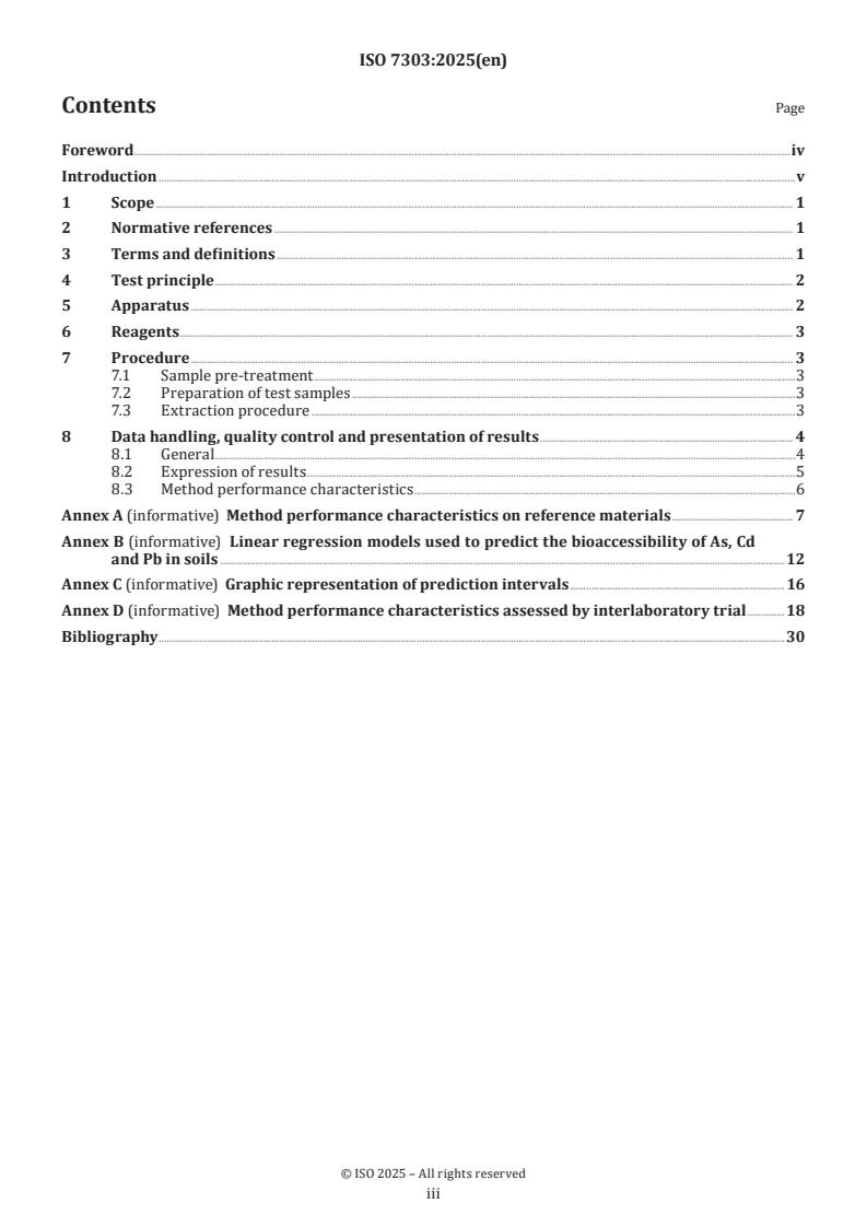 ISO 7303:2025 is a standard published by the International Organization for Standardization (ISO). Its full title is "Simplified method for prediction of the oral bioaccessibility of metals and metalloids in soils". This standard covers: This document deals with the assessment of human exposure to metals and metalloids from ingestion of soil. It specifies a simplified method for the prediction of the oral bioaccessibility of metals and metalloids from contaminated soils. The method is a chemical extraction using hydrochloric acid (HCl) and can be used at least for first-tier screening for prediction of the oral bioaccessibility of arsenic (As), cadmium (Cd) and lead (Pb) in soil samples. It produces extracts that are representative of the bioaccessible concentrations measured by using the validated unified bioaccessibility method (UBM) (ISO 17924). More specifically, from the extractable concentrations of metals and metalloids by HCl, the predicted bioaccessibility in both the gastric and gastrointestinal phases is calculated using the equations and the prediction intervals provided in this document, and which have been derived from simple linear regressions of data obtained during validation studies.[ REF Reference_ref_2 \r \h 2 08D0C9EA79F9BACE118C8200AA004BA90B0200000008000000100000005200650066006500720065006E00630065005F007200650066005F0032000000 ] NOTE The simplified method is applicable to prediction of the metals and metalloids bioaccessibility in soil with total concentrations range from 2 mg/kg to 2 600 mg/kg for As, from 0,2 mg/kg to 480 mg/kg for Cd, and from 4 mg/kg to 50 000 mg/kg for Pb.