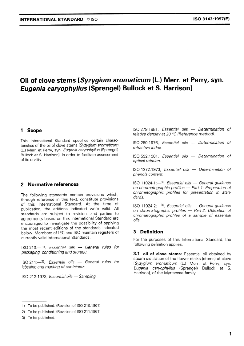 ![ISO 3143:1997 ISO 3143:1997 - Oil of clove stems [Syzygium aromaticum (L.) Merr. et Perry, syn. Eugenia caryophyllus (Sprengel) Bullock et S. Harrison]