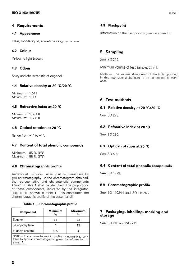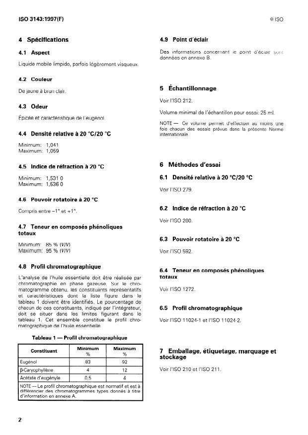 ![ISO 3143:1997 ISO 3143:1997 - Huile essentielle de griffes de giroflier [Syzygium aromaticum (L.) Merr. et Perry, syn. Eugenia caryophyllus (Sprengel) Bullock et S. Harrison] - Page 3 preview](https://cdn.standards.iteh.ai/images/8314/e0fa101bf5f7402aae6e3bae87c62531/page3.jpg)