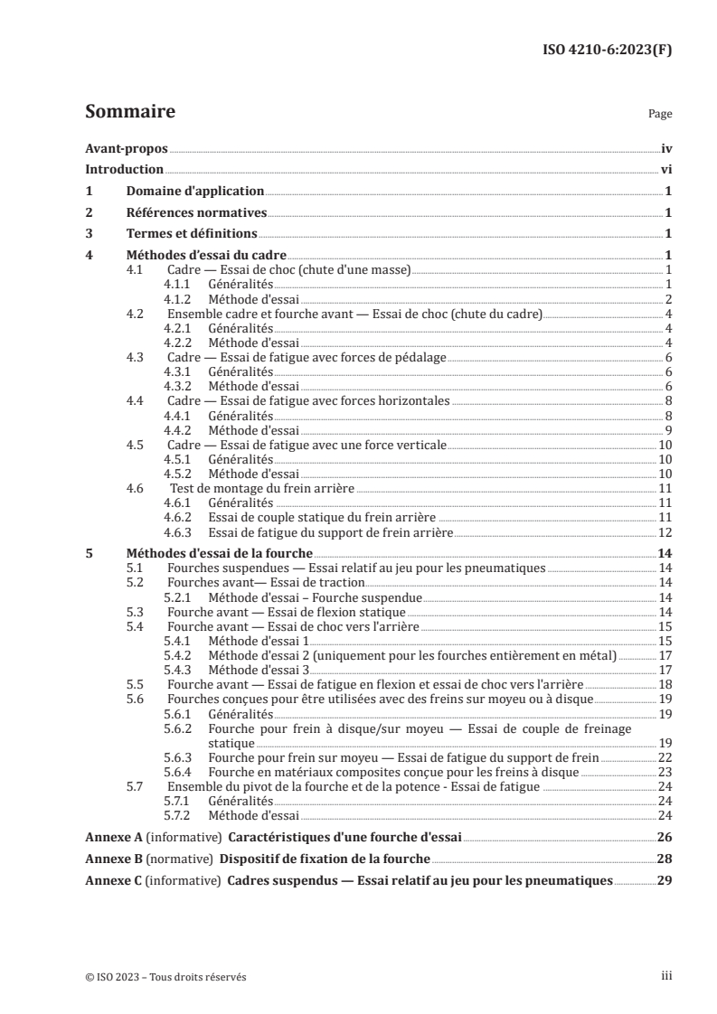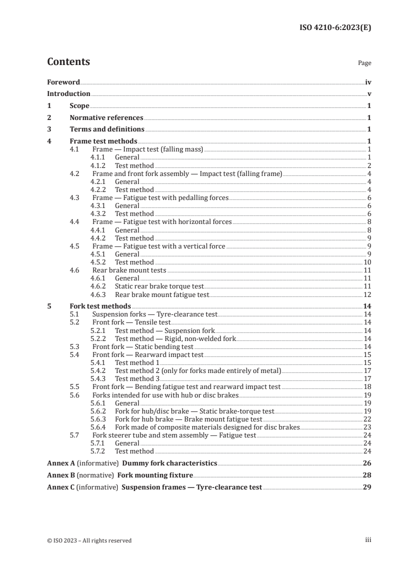 Keywords: ISO 4210-6:2023, bicycle frame test methods, fork test methods, bicycle safety standards, frame and fork fatigue test, impact test, brake mount test, suspension fork tyre clearance.
