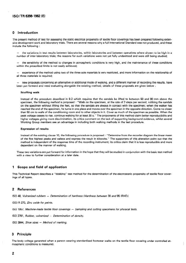 ISO/TR 6356:1982 is a technical report published by the International Organization for Standardization (ISO). Its full title is "Textile floor coverings — Assessment of static electrical propensity — "Walking" test". This standard covers: Textile floor coverings — Assessment of static electrical propensity — "Walking" test