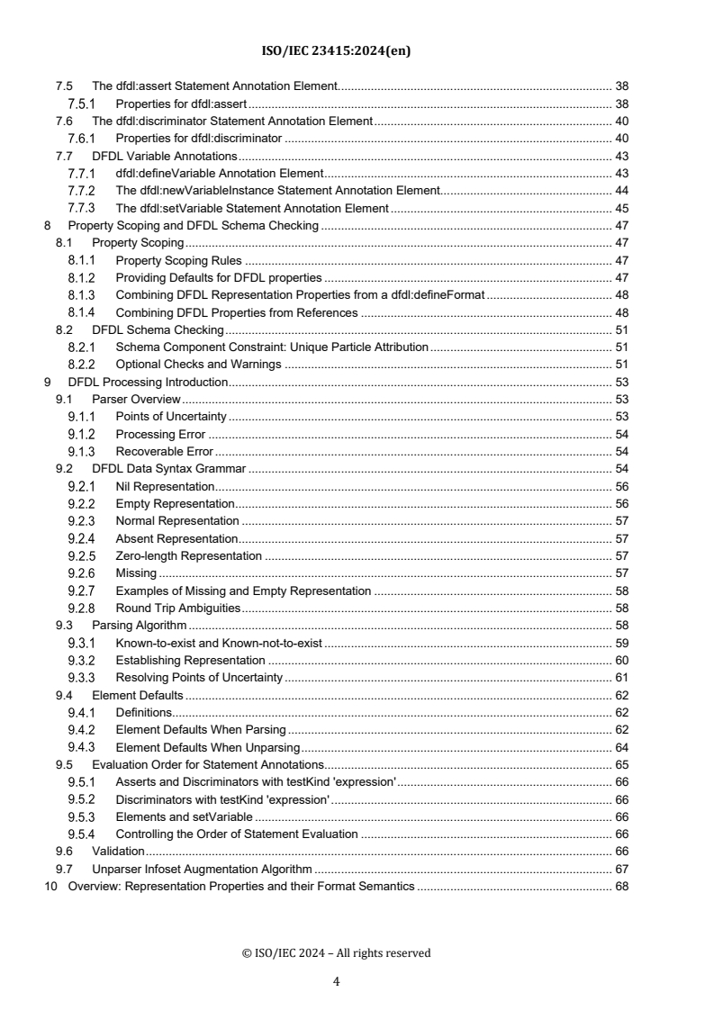 ISO/IEC 23415:2024 defines the Data Format Description Language (DFDL) v1.0, a formal specification for describing the physical representation of binary and text data so that it can be parsed into, and unparsed from, a structured information set (infoset). The standard provides a schema-based model and annotation language that extends a subset of XML Schema (XSD) to express framing, encoding, alignment, delimiters, lengths, number and string formats, escape schemes, and other representation properties for arbitrary data formats.