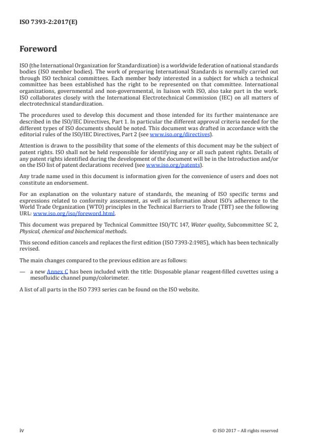 ISO 7393-2:2017 specifies a method for the determination of free chlorine and total chlorine in water, readily applicable to lab- and field-testing. It is based on measurement of the absorption, the red DPD colour complex in a photometer or the colour intensity by visual comparison of the colour with a scale of standards that is regularly calibrated. This method is appropriate for drinking water and other waters, where additional halogens like bromine, iodine and other oxidizing agents are present in almost negligible amounts. Seawater and waters containing bromides and iodides comprise a group for which special procedures are to be carried out. This method is in practice applicable to concentrations, in terms of chlorine (Cl2), from, for example, 0,000 4 mmol/l to 0,07 mmol/l (e.g. 0,03 mg/l to 5 mg/l) total chlorine. For higher concentrations, the test portion is diluted. Commonly, the method is applied as a field method with mobile photometers and commercially available ready-for-use reagents (liquid reagents, powders and tablets). It is essential that those reagents comply with minimum requirements and contain the essential reagents and a buffer system suitable to adjust the measurement solution to a pH range of typically 6,2 to 6,5. If there is doubt that water samples have uncommon pH values and/or buffer capacities, the user has to check and, if necessary, to adjust the sample pH to the required range. The pH of the sample is within the range of pH 4 and 8. Adjust, if necessary, with sodium hydroxide solution or sulfuric acid before the test. A procedure for the differentiation of combined chlorine of the monochloramine type, combined chlorine of the dichloramine type and combined chlorine in the form of nitrogen trichloride is presented in Annex A. In Annex C, a procedure is presented for the determination of free and total chlorine in drinking and other low polluted waters, for disposable planar reagent-filled cuvettes using a mesofluidic channel pump/colorimeter.