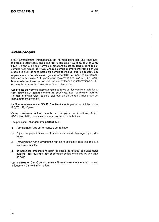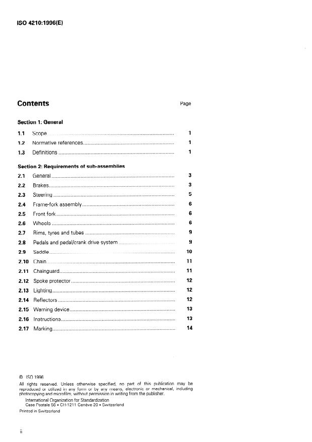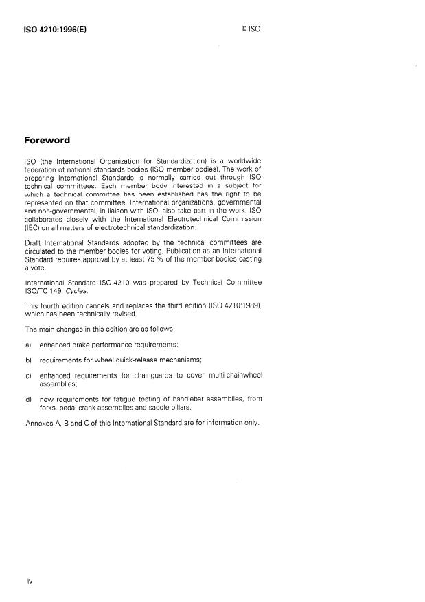 ISO 4210:1996 is a standard published by the International Organization for Standardization (ISO). Its full title is "Cycles — Safety requirements for bicycles". This standard covers: Specifies safety and performance requirements for the design, assembly and testing of bicycles. Contains guidelines for instructions on the use and care of bicycles. Does not apply to special types of bicycles such as tandems, toy bicycles etc..