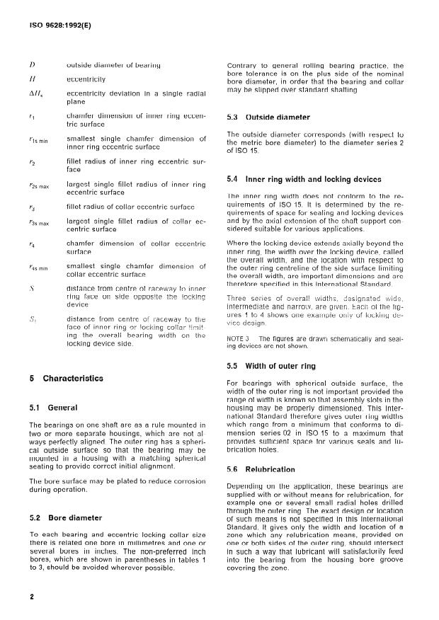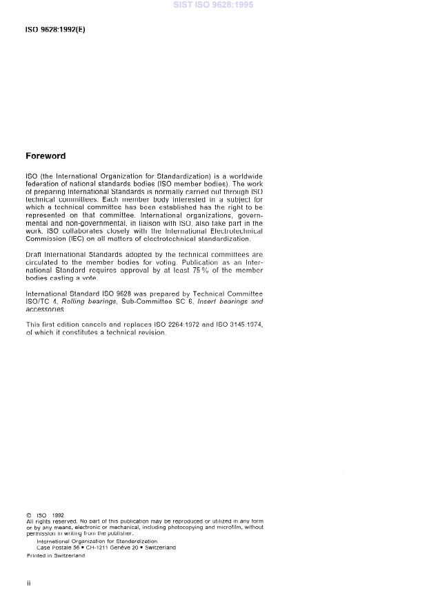 ISO 9628:1992 is a standard published by the International Organization for Standardization (ISO). Its full title is "Rolling bearings — Insert bearings and eccentric locking collars". This standard covers: Specifies the characteristics, boundary dimensions (in mm and in), tolerances and radial internal clearances.