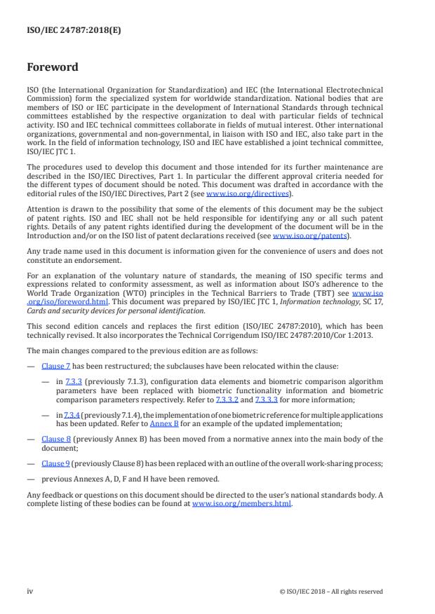 ISO/IEC 24787:2018 is a standard published by the International Organization for Standardization (ISO). Its full title is "Information technology - Identification cards - On-card biometric comparison". This standard covers: This document establishes - architectures of biometric comparison using an ICC, - on-card biometric comparison, both in sensor-off-card systems and as part of biometric system-on-card, - work-sharing on-card biometric comparison, and - security policies for on-card biometric comparison. This document does not establish - requirements for off-card biometric comparison, - requirements for biometric system-on-card (as defined in ISO/IEC 17839), or - modality-specific requirements for storage and comparison.