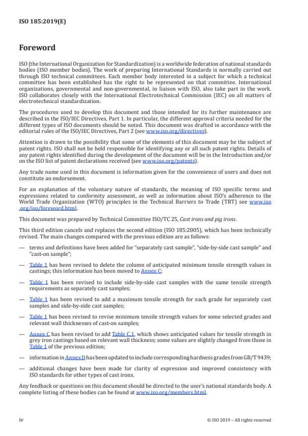 ISO 185:2019 is a standard published by the International Organization for Standardization (ISO). Its full title is "Grey cast irons — Classification". This standard covers: This document specifies the properties of unalloyed and low-alloyed grey cast irons used for castings that have been manufactured in sand moulds or in moulds with comparable thermal behaviour. This document specifies the characterizing properties of grey cast irons by any of the following: a) the tensile strength of cast samples; b) if agreed by the manufacturer and the purchaser, the tensile strength of samples cut from a casting; c) if agreed between the manufacturer and the purchaser, the hardness of the material determined on castings or on a cast-on knob. If agreed by the manufacturer and the purchaser, the combination of tensile strength from option a) or option b) and plus hardness from option c) can be specified. Information on specifying a combination of tensile strength and hardness is given in Annex B. This document specifies eight grades of grey cast iron according to tensile strength (see Table 1) and six grades of grey cast iron according to Brinell hardness (see Table 2). This document does not apply to grey cast irons used for pipes and pipe fittings and continuous cast products. This document does not cover technical delivery conditions for grey iron castings. NOTE General information on the engineering properties of grey cast irons is provided in ISO/TR 10809-1.