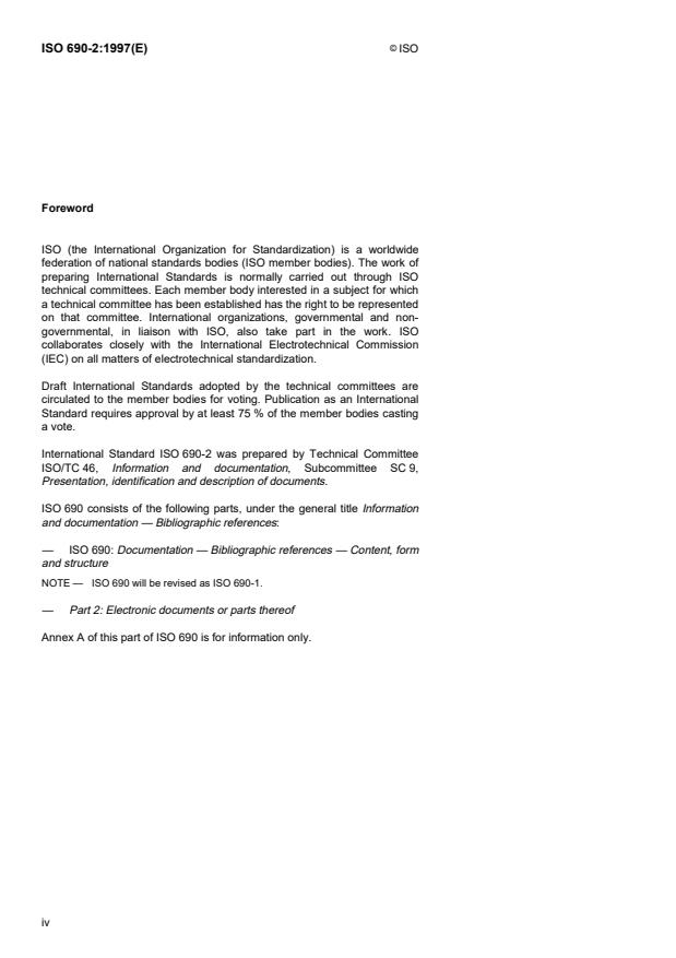 ISO 690-2:1997 is a standard published by the International Organization for Standardization (ISO). Its full title is "Information and documentation — Bibliographic references — Part 2: Electronic documents or parts thereof". This standard covers: La présente partie de l'ISO 690 précise les éléments à mentionner dans les références bibliographiques aux documents électroniques. Elle détermine un ordre obligatoire pour les éléments de la référence et établit des règles pour la transcription et la présentation de l'information provenant du document électronique source. La présente partie de l'ISO 690 est destinée aux auteurs et aux éditeurs pour l'établissement de listes de références de documents électroniques à inclure dans une bibliographie, et pour la formulation des citations dans le texte correspondant aux entrées de la bibliographie. Elle ne s'applique pas aux descriptions bibliographiques complètes exigées par les bibliothécaires, les bibliographes, les indexeurs, etc.