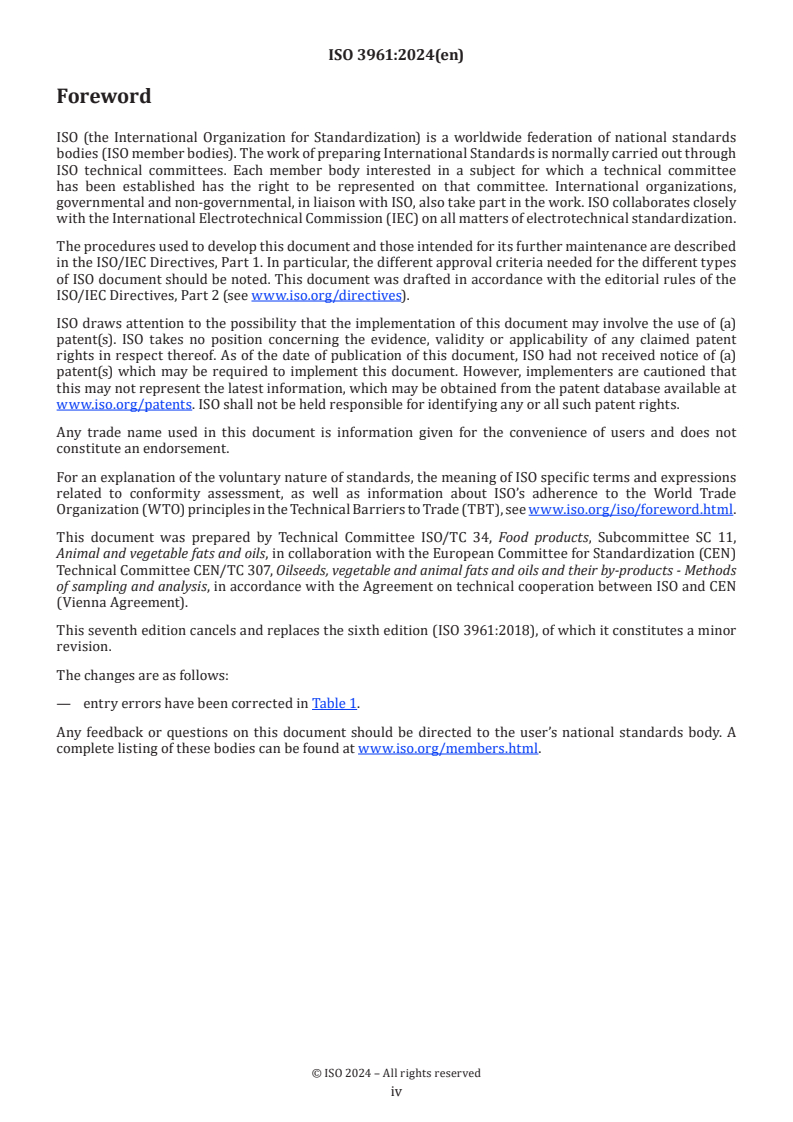 ISO 3961:2024 is a standard published by the International Organization for Standardization (ISO). Its full title is "Animal and vegetable fats and oils - Determination of iodine value". This standard covers: This document specifies a reference method for the determination of the iodine value (commonly known in the industry as IV) of animal and vegetable fats and oils, hereinafter referred to as fats. Annex B describes a method for the calculation of the IV from fatty acid compositional data. This method is not applicable to fish oils. Furthermore, cold-pressed, crude and unrefined vegetable oils as well as (partially) hydrogenated oils can give different results by the two methods. The calculated IV is affected by impurities and thermal degradation products. NOTE The method in Annex B is based upon the AOCS Official method Cd 1c-85[10].