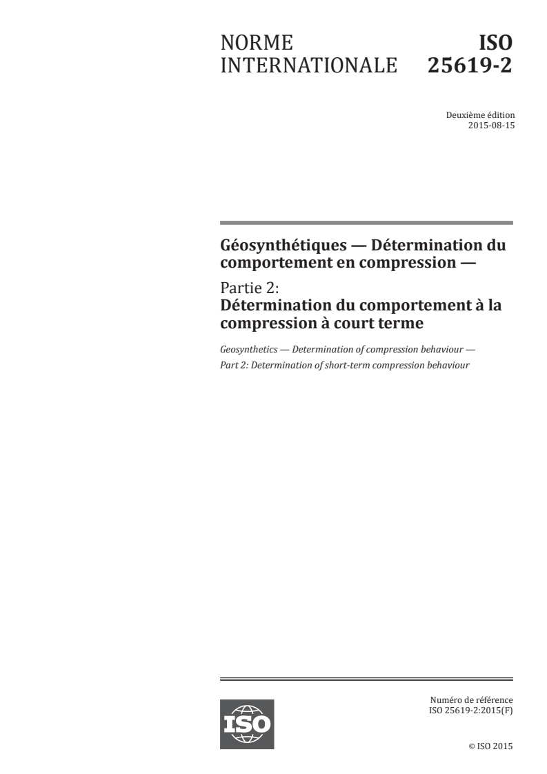 ISO 25619-2:2015 - Géosynthétiques — Détermination du comportement en compression — Partie 2: Détermination du comportement à la compression à court terme/24/2019