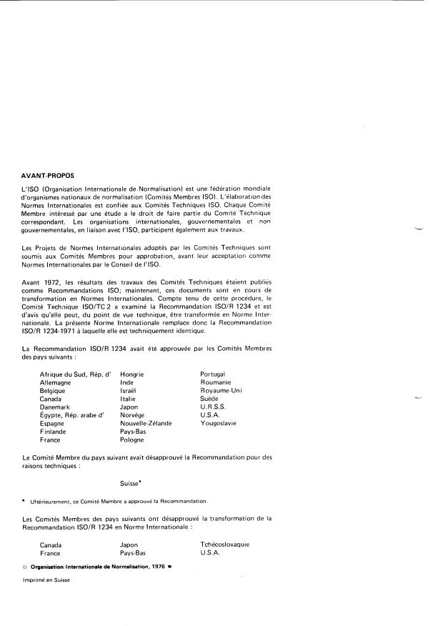 Comité Technique ISO/TC2 a examiné la Recommandation ISO/R 1234 et est
